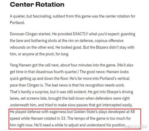 杨瀚森在首场季前赛表现不佳,他出战21分钟,5投2中,得到4分4篮板1助攻,出现4次失误和6次犯规。开拓者跟队记者戴夫·戴卡德撰文解析了开拓者的首场季前赛,其中包括中锋轮换的片段,他指出杨瀚森跑动速度其实并不慢,但是他的意识偏慢,也就是他的场上意识暂时还跟不上快节奏的NBA比赛。