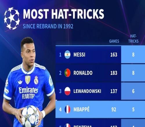 欧冠92年改制后戴帽数前10:梅西、C罗8次第1,姆巴佩5次第4